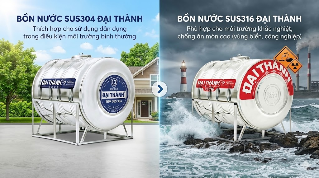 Bồn inox 316 Đại Thành thích hợp cho các nhu cầu dùng nước sạch gia đình, công nghiệp vừa và nhỏ với sự đảm bảo an toàn, bền bỉ và thẩm mỹ cao.