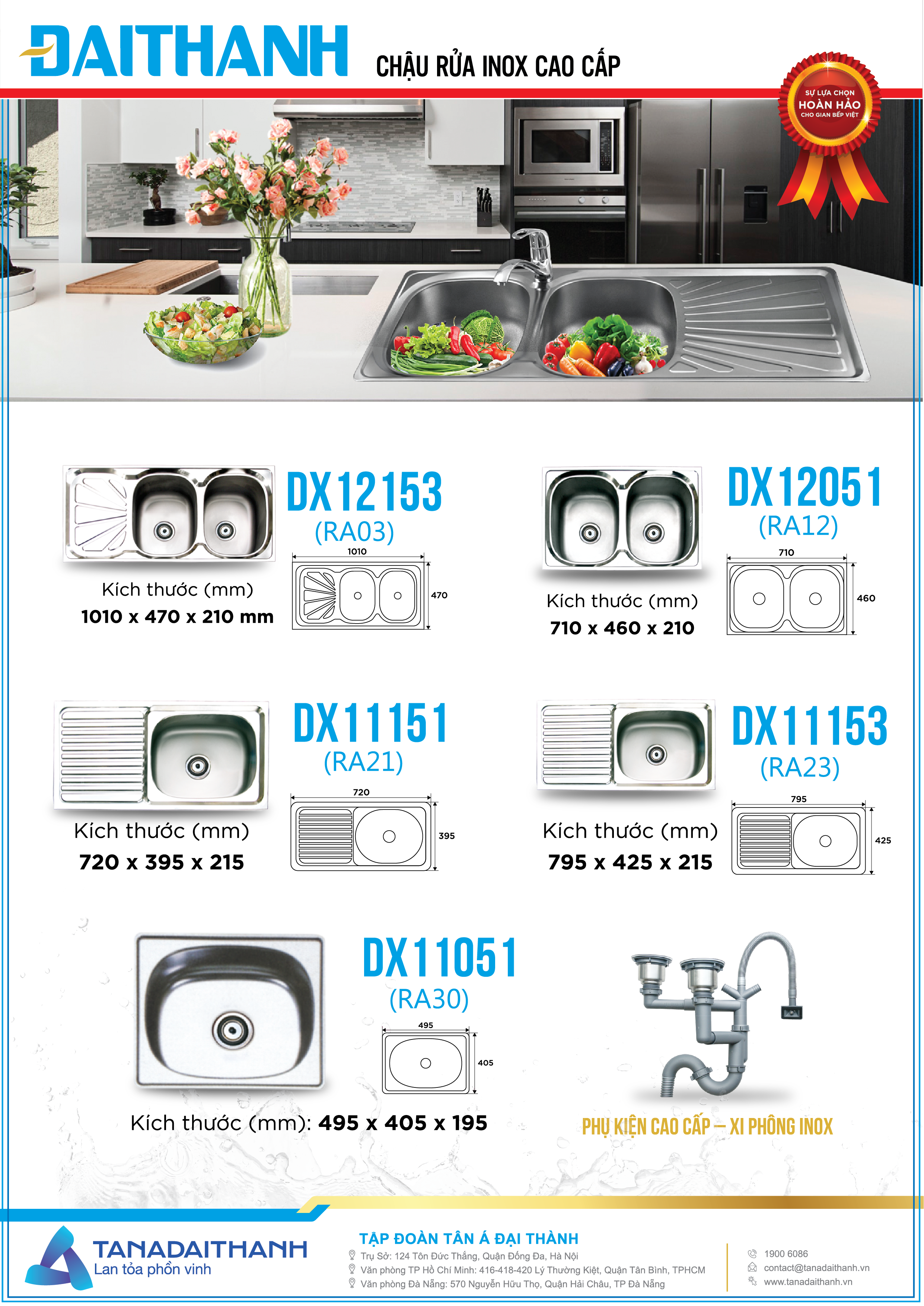 Chậu rửa inox Đại Thành đa dạng về mẫu mã, chủng loại, với các dòng sản phẩm khác nhau như chậu rửa 1 hố không bàn, chậu rửa 1 hố có bàn, chậu rửa hai hố, …đáp ứng nhu cầu và sở thích khác nhau của người tiêu dùng.