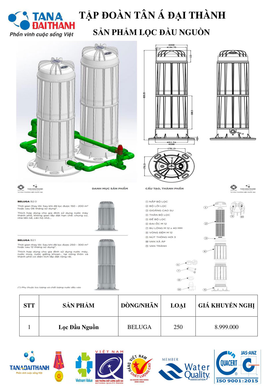 - Tổng dung tích lọc: * 250 - 300 m³ hoặc 12 tháng với dòng sản phẩm Beluga B2.1
