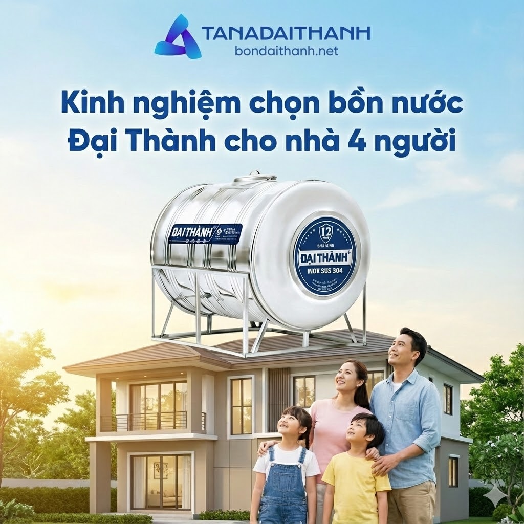 Với nhà 4 người, nên ưu tiên bồn nước Đại Thành dung tích khoảng 1000–1500 lít, chọn inox 304 nếu nước máy/nước giếng đã xử lý, và chú ý nền đặt bồn chắc, thoáng, tránh gió bão trực tiếp.